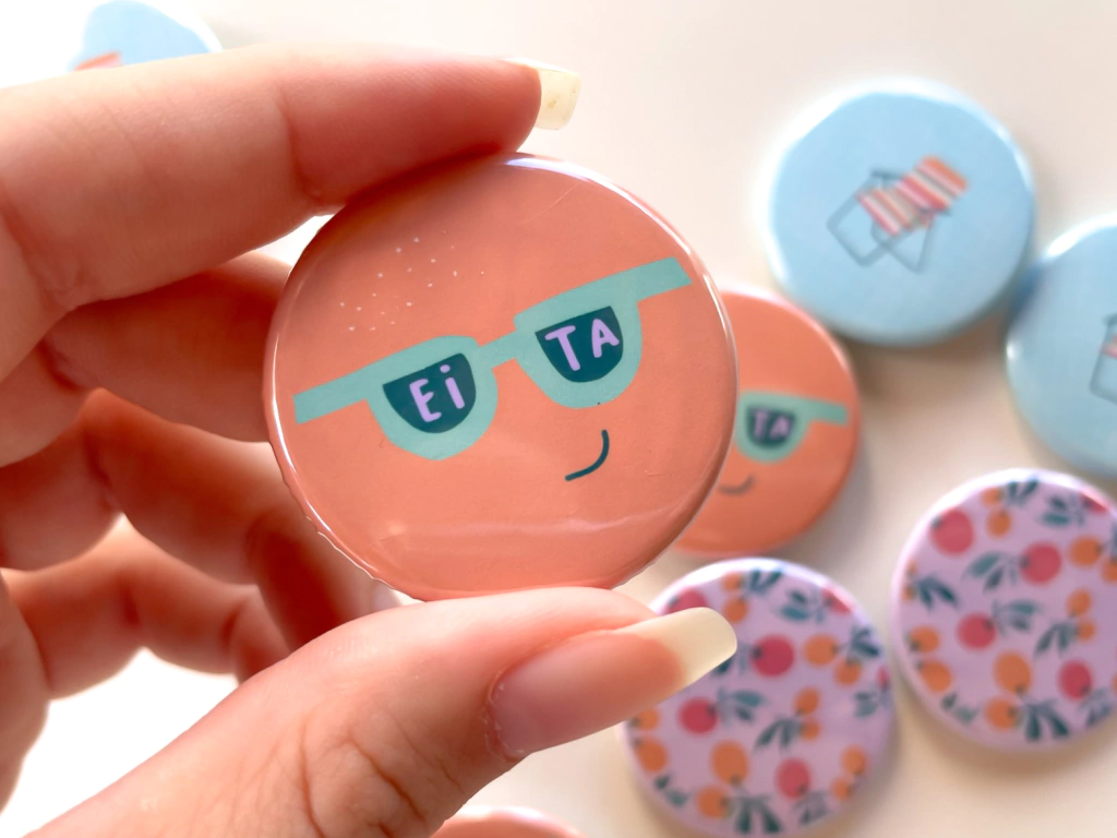 Este kit possui 3 bottons com estampas exclusivas: o primeiro é o azul com a cadeirinha de praia; o segundo é uma estampa fofa de frutinhas; e o terceiro é uma carinha de óculos com a frase "eita".